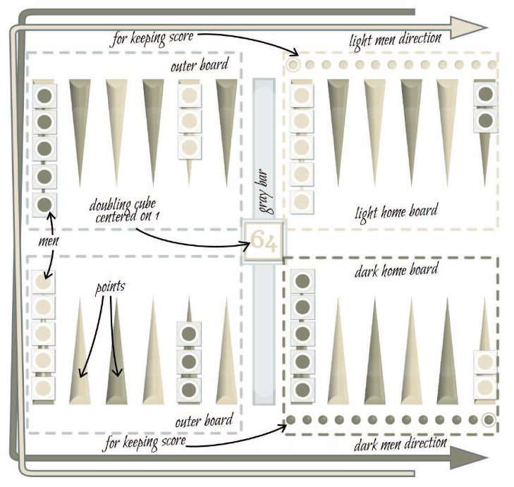 There are 24 markings called the points. When multiple men (pieces) occupy the same point, they are placed in a line. Backgammon is, basically, a racing game in which the men will move through the board trying to reach and ultimately leave your home board. The direction and path the men take when moving is represented on the image. The games is divided in four quadrants called boards, each composed of six points. Each player has his own home board (we've added dots under these to keep score), and there are two outer boards.