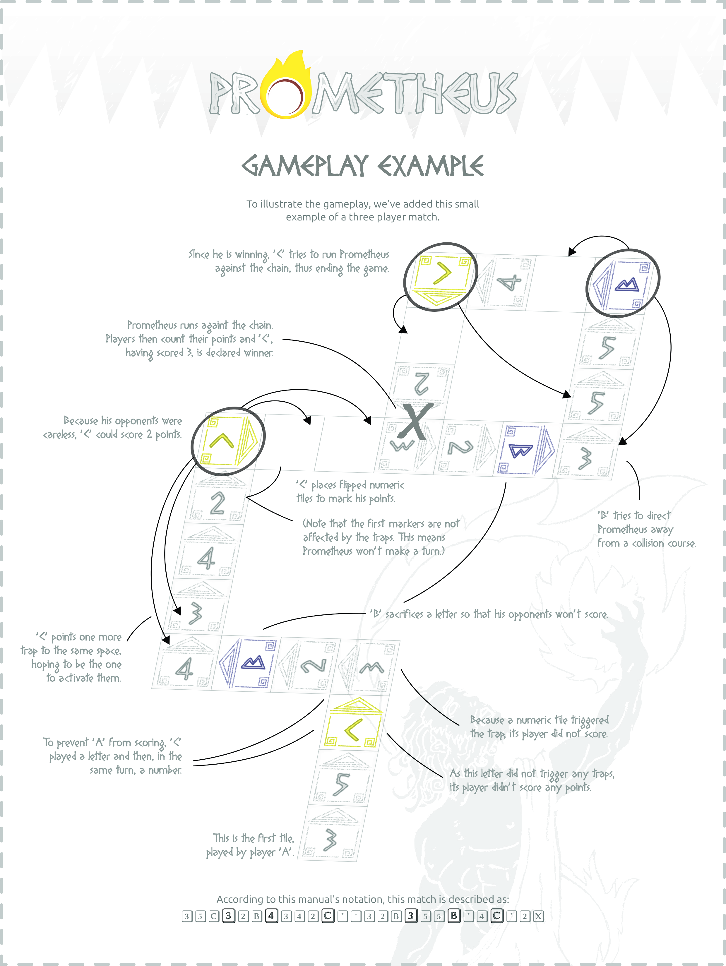 In Prometheus your goal is to catch the fleeing Titan with traps. On his turn, each player will lay tiles, forming a chain (the path of Prometheus). Each tile contains a number indicating how many steps until a Prometheus falls into a trap. Players may lay down tiles claiming this traps or scrambling the order, in order to prevent his opponents from scoring. The player who succesfully hits him with most traps wins.